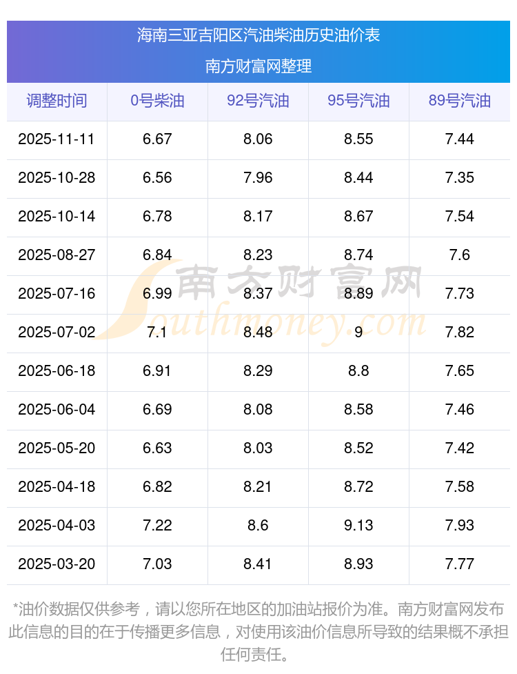 11月22日,海南三亚吉阳区汽油、柴油每升最新价格:本轮的油价调整时间是11月11日,92号汽油为8.06元,上涨了0.1元,上涨幅达1.26%;95号汽油为8.55元,上涨了0.11元,上涨幅达1.3%;89号汽油为7.44元,上涨了0.09元,上涨幅达1.22%;0号柴油为6.67元,上涨了0.11元,上涨幅达1.68%。