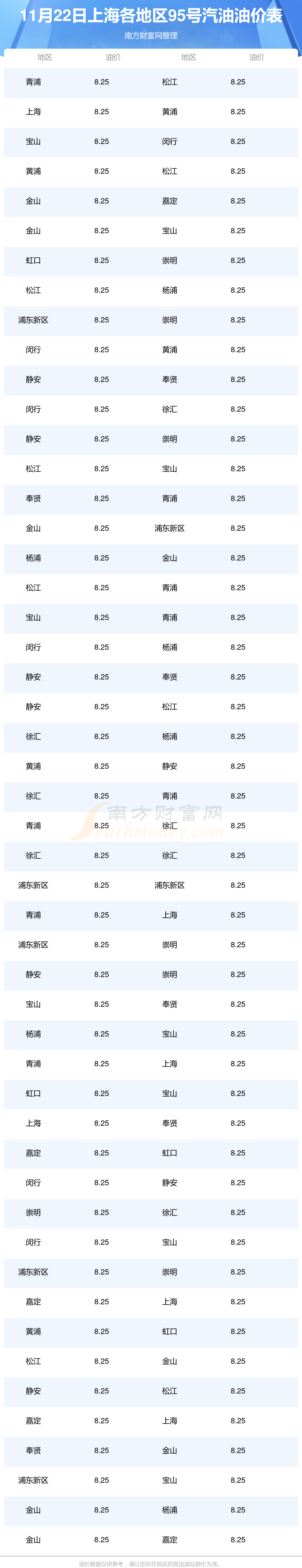 11月22日上海95号汽油最新价格7.35元/升,调整时间为11月11日,相对上次调整上调了0.11元。