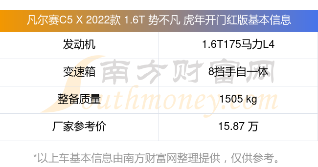 凡尔赛C5 X 2022款 1.6T 势不凡 虎年开门红版搭载了一台1.6T175马力L4涡轮增压发动机,采用8挡手自一体自动档变速箱,常规整备质量1505kg,厂家参考价15.87万元。