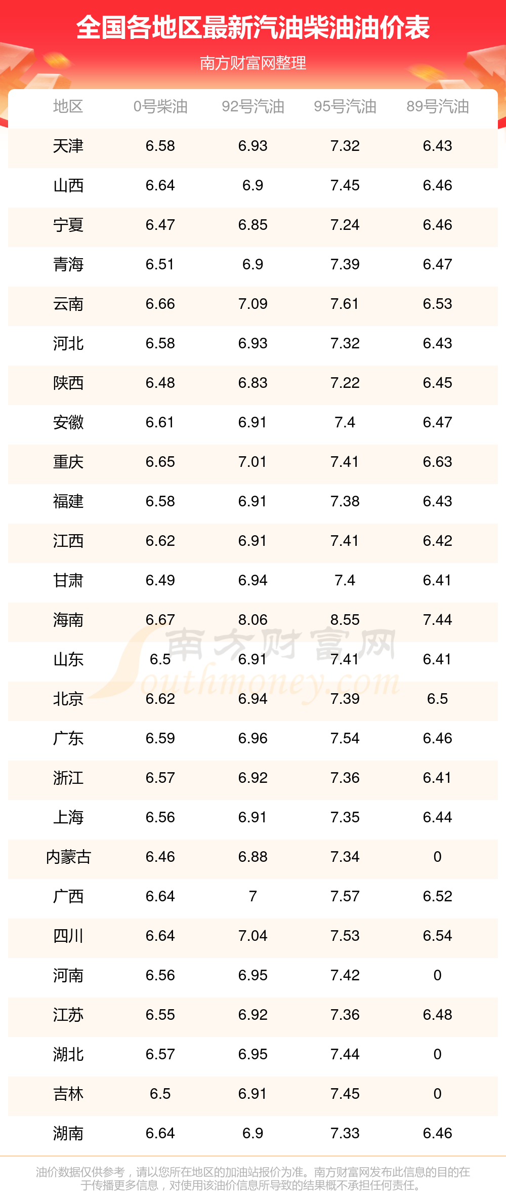 以上数据仅供参考,请以您所在地区的加油站实际售价为准。开云手机web版登录入口发布此信息的目的在于传播更多信息,对使用该油价信息所导致的结果概不承担责任。