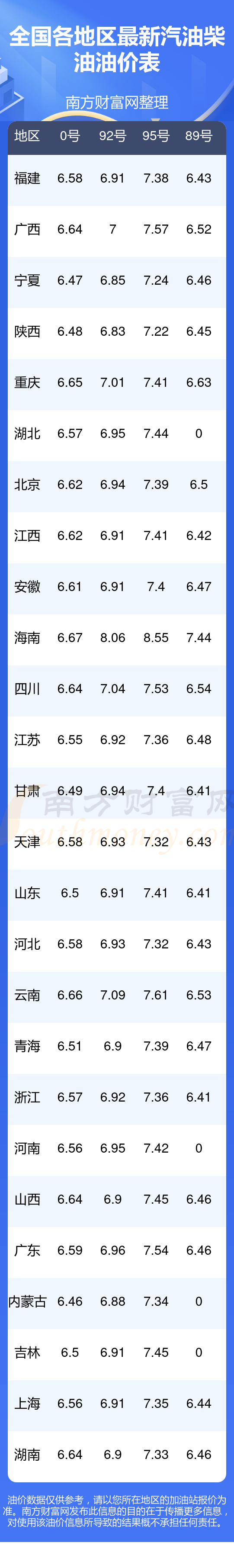 油价最新调整时间为11月11日 ,全国92号汽油最新平均价格为:7元每升,其中,最高为海南,价格为8.06元/升,最低为陕西,价格为6.83元/升。全国95号汽油最新平均价格为:7元每升,其中,最高为海南,价格为8.55元/升,最低为陕西,价格为7.22元/升。全国0号柴油最新平均价格为:7元每升,其中,最高为海南,价格为6.67元/升,最低为内蒙古,价格为6.46元/升。全国89号汽油最新平均价格为:7元每升,其中,最高为海南,价格为7.44元/升,最低为浙江,价格为6.41元/升。,下一轮油价调整时间11月24日24时,距离现在还有2.44天。