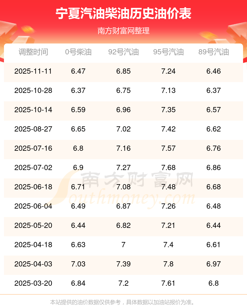 宁夏92号汽油油价调整表
