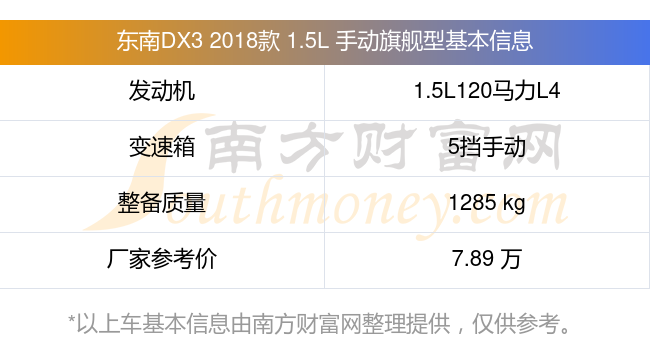 在动力方面,东南DX3 2018款 1.5L 手动旗舰型搭载的是一台1.5L120马力L4自然吸气发动机,匹配5挡手动挡变速箱,燃料形式为汽油,常规整备质量1285kg,厂家参考价7.89万元。