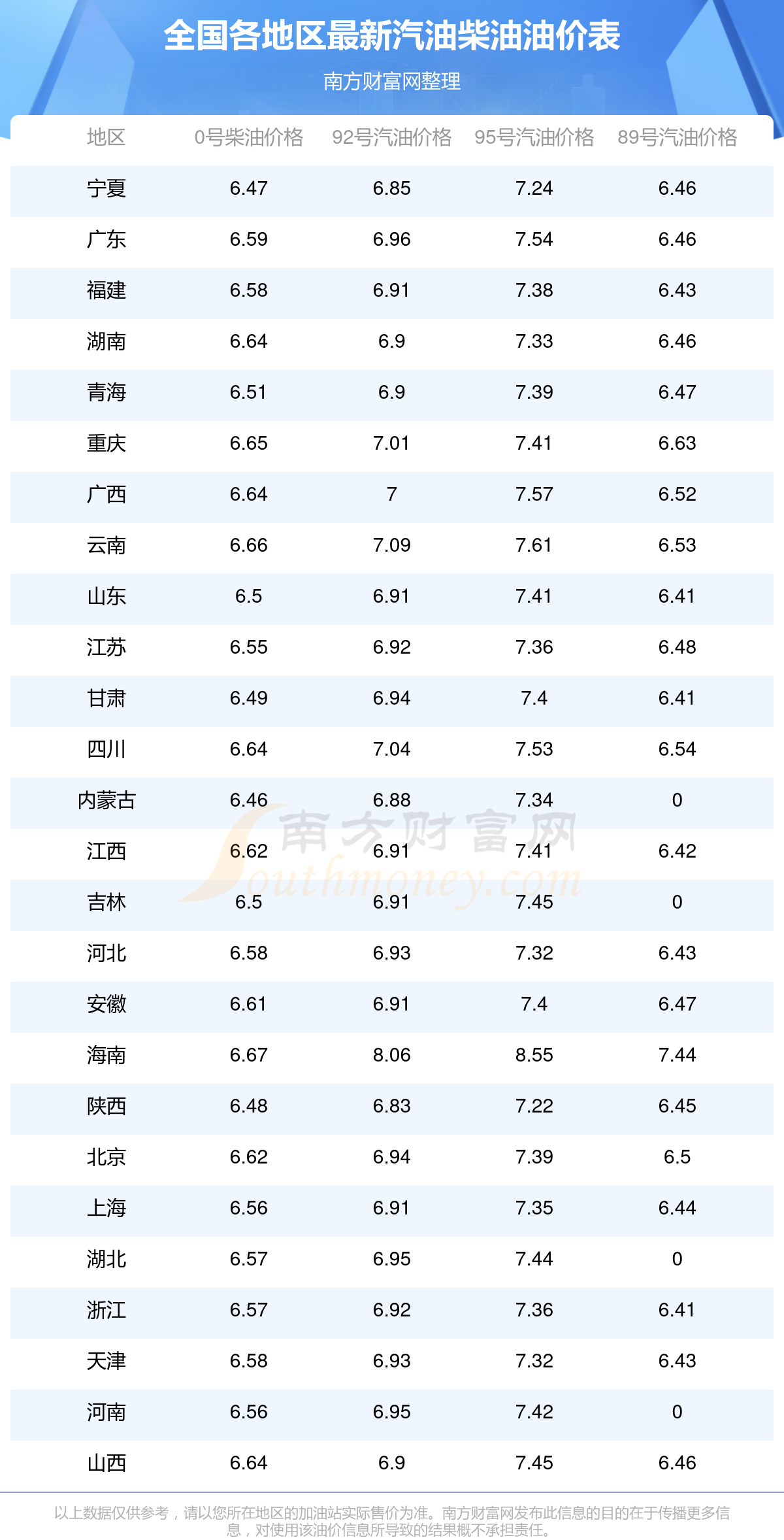 以上油价信息是当前市场上最新油价信息,油价数据仅供参考,实际在售油价可能有小幅偏差,请以您所在地区的加油站实际售价为准。