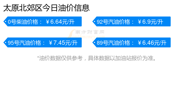 11月22日太原北郊区今日汽油价格如下:92号汽油6.9元;95号汽油7.45元;89号汽油6.46元;0号柴油6.64元(该价格为11月11日调整后的价格)。