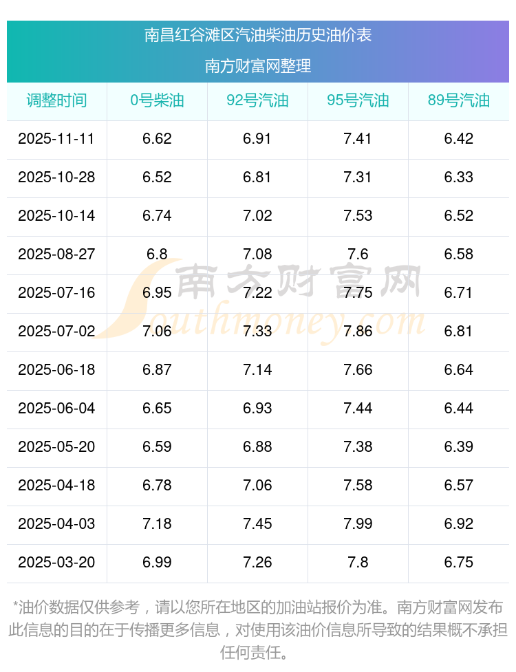 11月22日,南昌红谷滩区汽油、柴油每升最新价格:调整时间为11月11日,92号汽油为6.91元,上调了0.1元,上调幅达1.47%;95号汽油为7.41元,上调了0.1元,上调幅达1.37%;89号汽油为6.42元,上调了0.09元,上调幅达1.42%;0号柴油为6.62元,上调了0.1元,上调幅达1.53%。