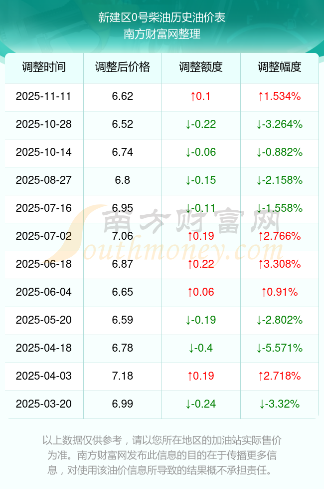 11月22日,新建区最新价格为:6.62元每升,调整时间为11月11日,相对上次调整时间10月28日的油价6.52元每升,上调了0.1元,上调幅达1.534%。