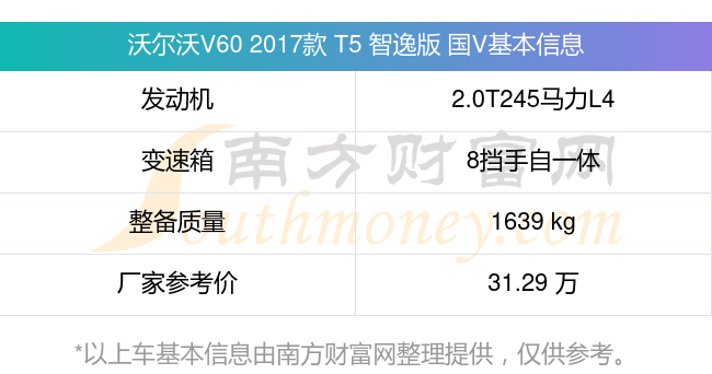沃尔沃V60 2017款 T5 智逸版 国V动力方面,搭载的是一台2.0T245马力L4涡轮增压发动机,匹配8挡手自一体自动档变速箱,燃料形式为汽油,常规整备质量1639kg,厂家参考价31.29万元。