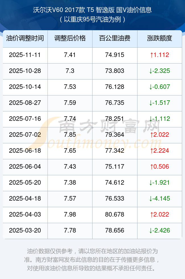 按照11月11日95号汽油最新调整价格7.41元/升来计算(以重庆为例),该车型百公里平均油费为74.915元,按照上一轮10月28日调整价格7.3元/升来计算,百公里平均油费为73.803元,对比上一轮多花1.112元,下一轮油价调整时间为11月24日24时。
