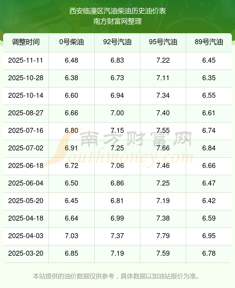 11月22日,西安临潼区汽油、柴油每升最新价格为:92号汽油为6.83元,增了0.1元;95号汽油为7.22元,增了0.11元;89号汽油为6.45元,增了0.1元;0号柴油为6.48元,增了0.1元,调整时间为11月11日。