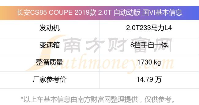 在动力上,长安CS85 COUPE 2019款 2.0T 自动动版 国VI配备的是一台2.0T233马力L4涡轮增压发动机,匹配的是8挡手自一体自动档变速箱,燃料形式为汽油,常规整备质量1730kg,厂家参考价14.79万元。