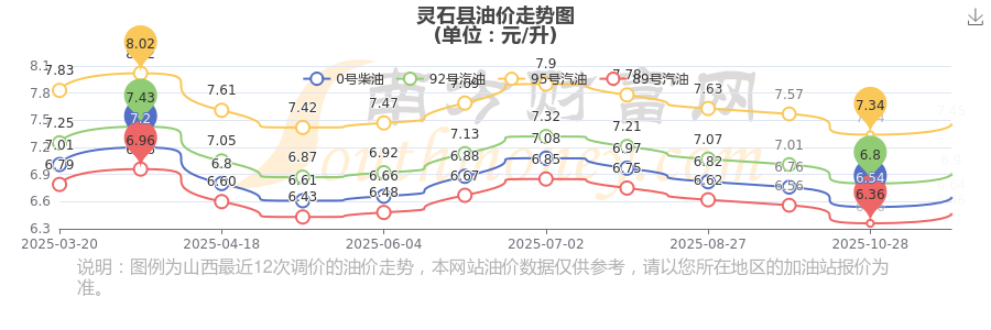 11月22日灵石县汽油、柴油每升的价格是11月11日调整后的价格:92号汽油为6.9元,上升了0.1元,上升幅达1.47%;95号汽油为7.45元,上升了0.11元,上升幅达1.5%;89号汽油为6.46元,上升了0.1元,上升幅达1.57%;0号柴油为6.64元,上升了0.1元,上升幅达1.53%。下一轮油价调整时间11月24日24时,距离现在还有2.39天。