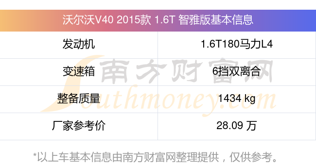 沃尔沃V40 2015款 1.6T 智雅版动力方面,搭载的是一台1.6T180马力L4涡轮增压发动机,匹配6挡双离合自动档变速箱,燃料形式为汽油,常规整备质量1434kg,厂家参考价28.09万元。
