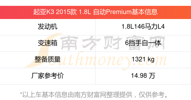 在动力上,起亚K3 2015款 1.8L 自动Premium配备的是一台1.8L146马力L4自然吸气发动机,匹配的是6挡手自一体自动档变速箱,燃料形式为汽油,常规整备质量1321kg,厂家参考价14.98万元。