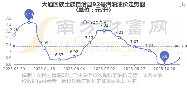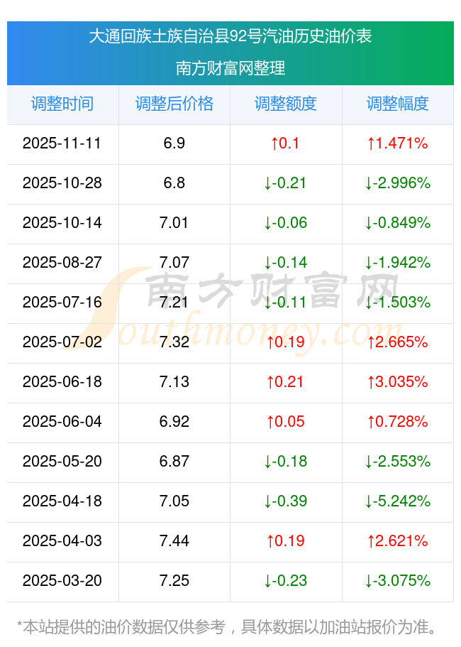 11月22日大通回族土族自治县92号汽油的价格为11月11日油价调整后的价格,每升6.9元,对比上一轮油价调整时间10月28日的价格6.8元每升,增了0.1元,增幅达1.471%。