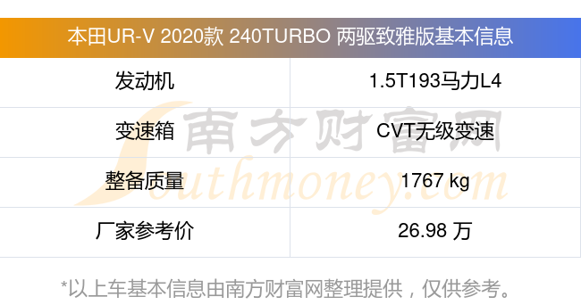 本田UR-V 2020款 240TURBO 两驱致雅版动力上搭载的是一台1.5T193马力L4涡轮增压发动机,匹配CVT无级变速自动档变速箱,燃料形式为汽油,常规整备质量1767kg,厂家参考价26.98万元。