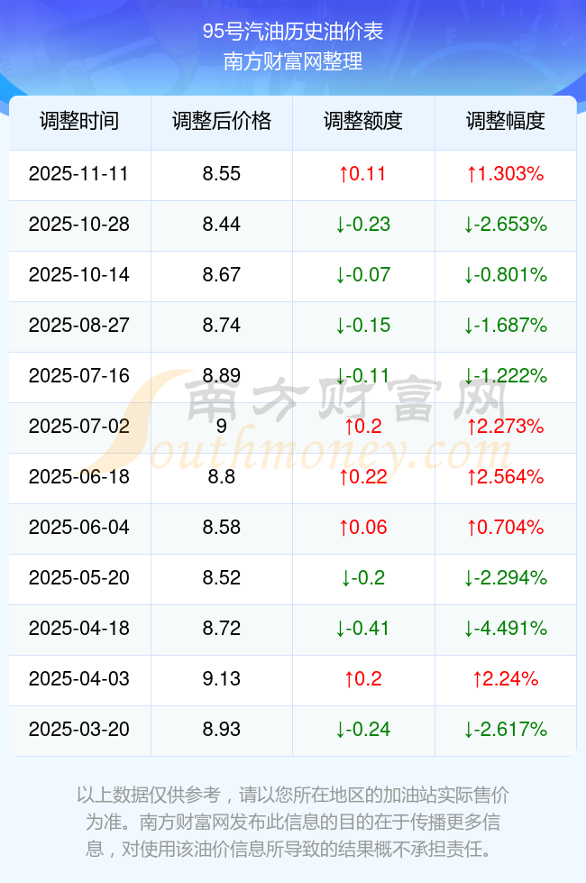 2025年油价调整时间及价格一览表