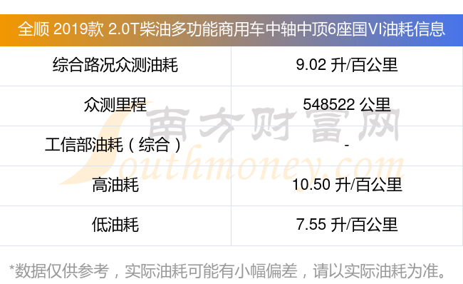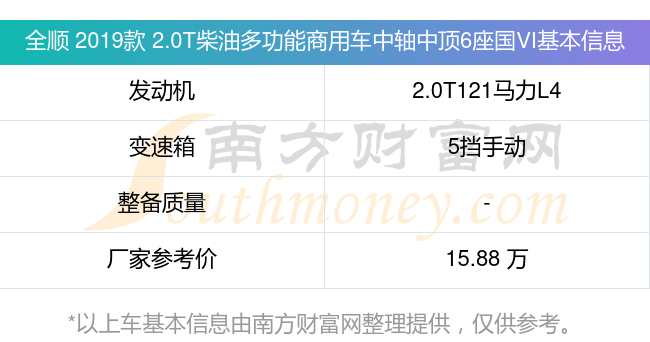 在动力上,全顺 2019款 2.0T柴油多功能商用车中轴中顶6座国VI配备的是一台2.0T121马力L4涡轮增压发动机,匹配的是5挡手动挡变速箱,燃料形式为柴油,厂家参考价15.88万元。