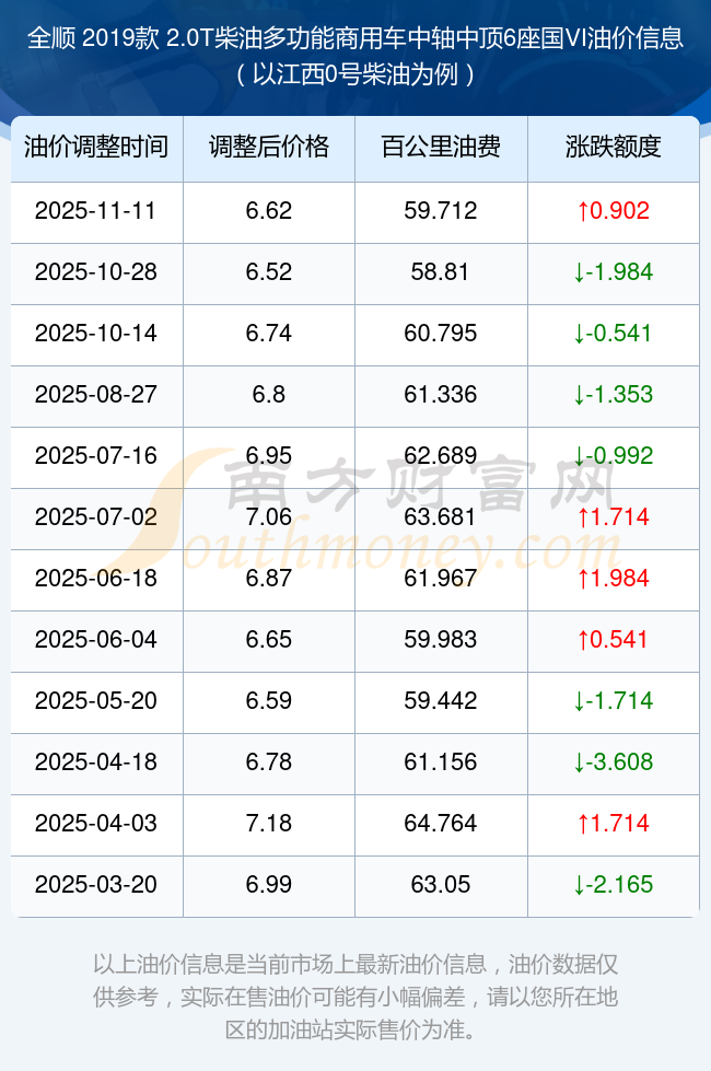 根据11月11日0号柴油最新调整价格6.62元/升来计算(以江西为例),该车型每百公里的平均油费是59.712元,上一轮10月28日调整价格6.52元每升来计算,每百公里的平均油费是58.81元,对比上一轮多花0.902元,下一轮的油价调整时间是11月24日24时。