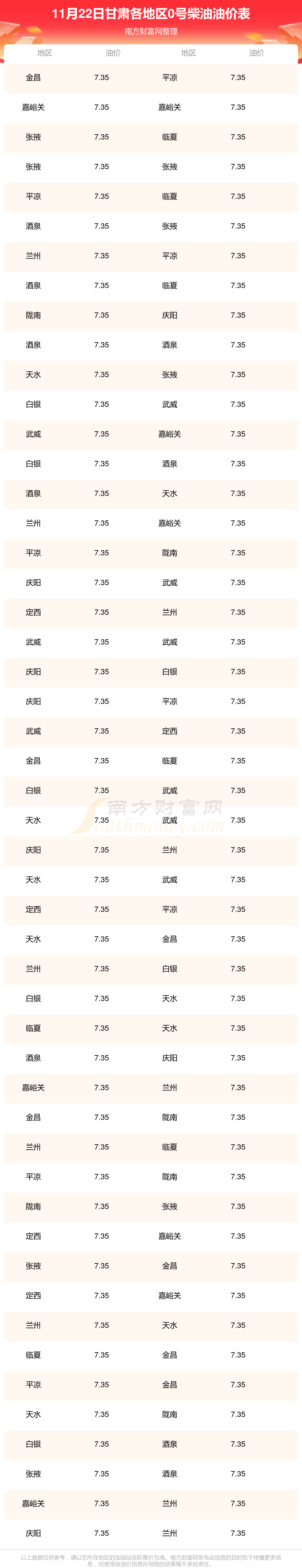 11月22日,甘肃0号柴油最新油价是6.49元每升,本轮调整时间为11月11日,相对上轮调整时间10月28日的油价6.39元/升,升了0.1元。