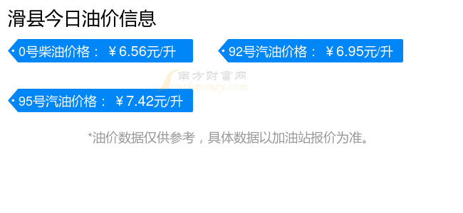 11月22日滑县汽油、柴油每升价格:距离最近的油价调整时间是11月11日,92号汽油为6.95元,上升了0.1元,上升幅达1.46%;95号汽油为7.42元,上升了0.11元,上升幅达1.51%;0号柴油为6.56元,上升了0.1元,上升幅达1.55%。