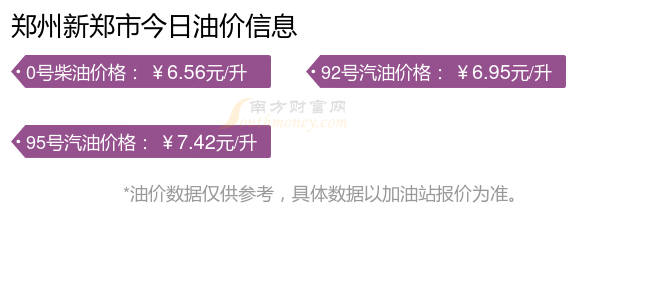 郑州新郑市汽油、柴油11月22日每升的价格(油价调整时间11月11日):92号汽油6.95元;95号汽油7.42元;0号柴油6.56元。