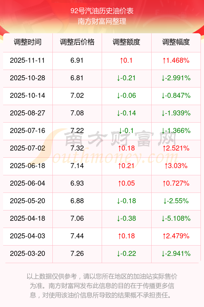 11月22日今日汽油价格如下:92号汽油6.91元;95号汽油7.4元;89号汽油6.47元;0号柴油6.61元(该价格为11月11日调整后的价格)。下一轮油价调整时间11月24日24时,距离现在还有2.35天。