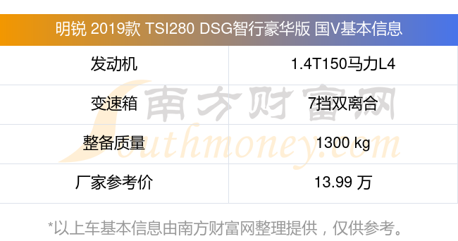 明锐 2019款 TSI280 DSG智行豪华版 国V搭载了一台1.4T150马力L4涡轮增压发动机,采用7挡双离合自动档变速箱,常规整备质量1300kg,厂家参考价13.99万元。