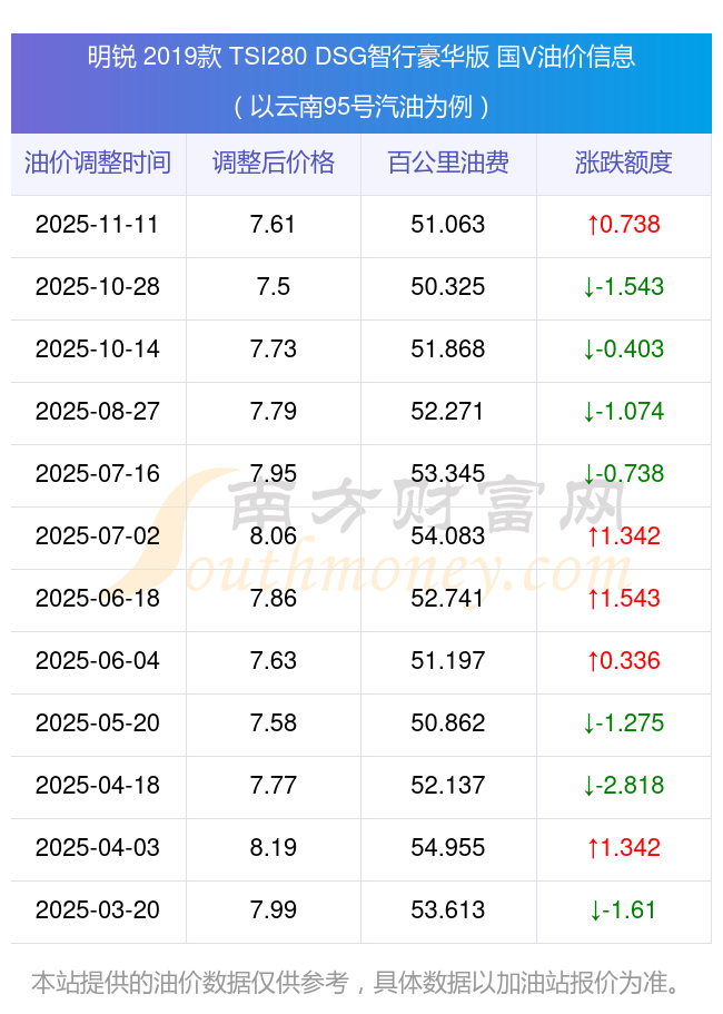 依照11月11日95号汽油最新调整价格7.61元/升来计算(以云南为例),该车型百公里的平均油费是51.063元,依照上一轮10月28日调整价格7.5元/升来计算,百公里的平均油费是50.325元,对比上一轮多花0.738元,下一轮的油价调整时间11月24日24时。