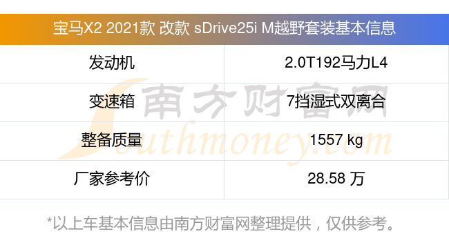 在动力上,宝马X2 2021款 改款 sDrive25i M越野套装配备的是一台2.0T192马力L4涡轮增压发动机,匹配的是7挡湿式双离合自动档变速箱,燃料形式为汽油,常规整备质量1557kg,厂家参考价28.58万元。