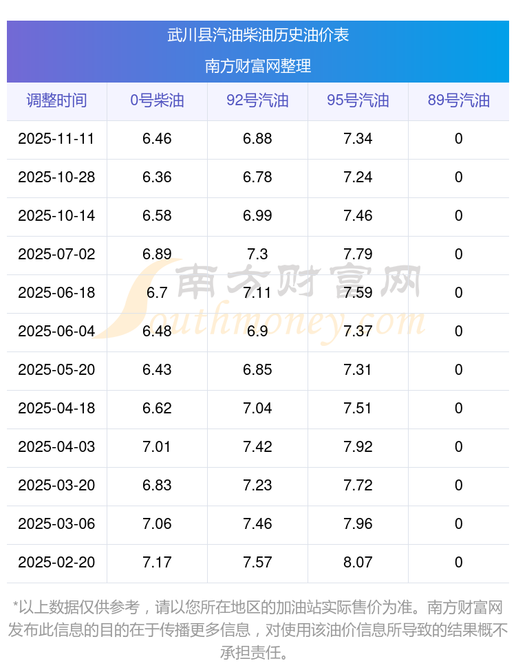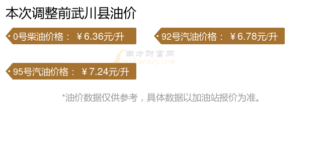 武川县汽油、柴油11月22日每升的价格具体是(11月11日调整后的价格):92号汽油6.88元;95号汽油7.34元;0号柴油6.46元。