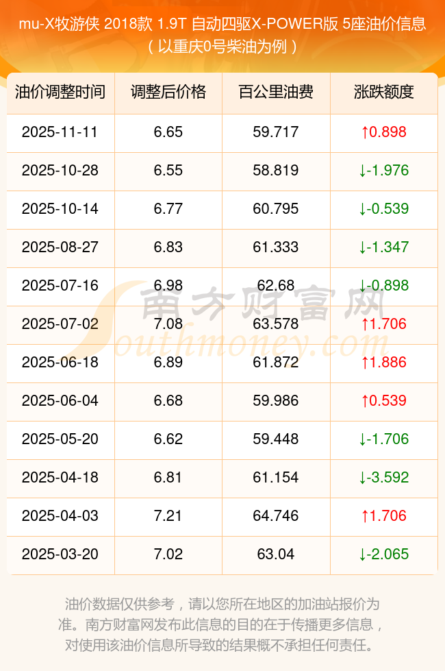 按照11月11日0号柴油最新调整价格6.65元/升来计算(以重庆为例),该车型百公里平均油费为59.717元,按照上一轮10月28日调整价格6.55元/升来计算,百公里平均油费为58.819元,对比上一轮多花0.898元,下一轮油价调整时间为11月24日24时。