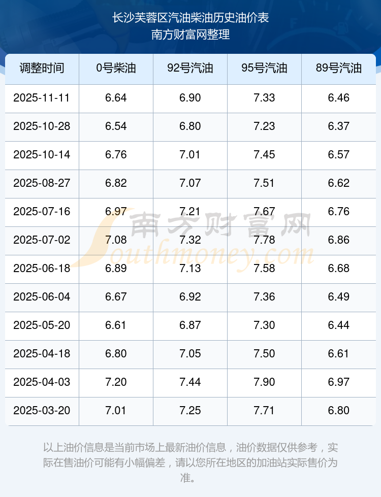 长沙芙蓉区汽油、柴油11月22日每升最新价格为:92号汽油为6.9元;95号汽油为7.33元;89号汽油为6.46元;0号柴油为6.64元,调整时间为11月11日。
