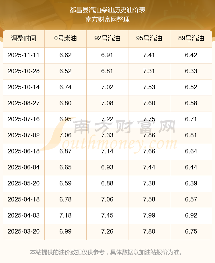 都昌县汽油、柴油11月22日每升最新价格为:0号柴油为6.62元,上涨了0.1元;95号汽油为7.41元;92号汽油为6.91元;89号汽油为6.42元,调整时间为11月11日。