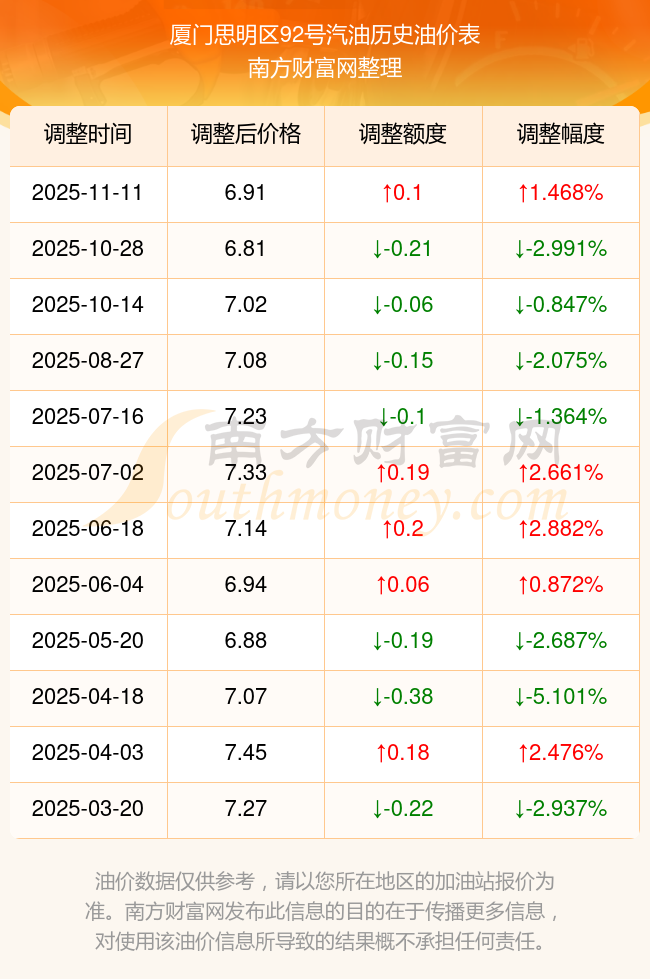 厦门思明区92号汽油历史油价表
