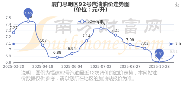 11月22日厦门思明区92号汽油的最新价格(11月11日调整后的价格):6.91元/升,相对上次调整涨了0.1元。