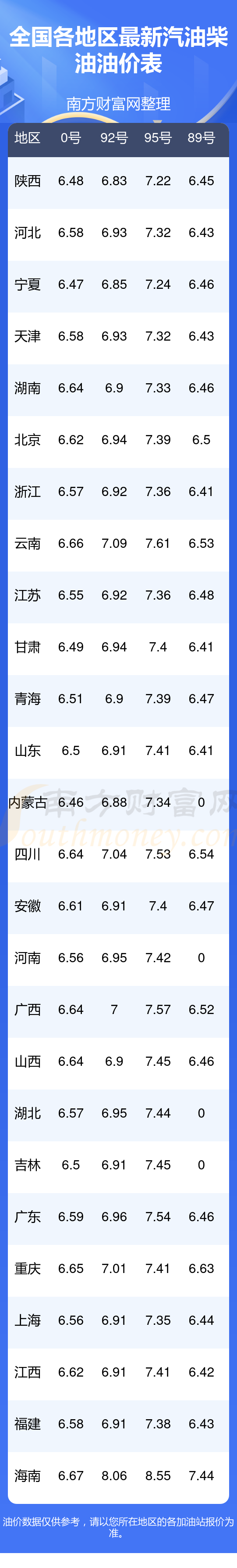 0号柴油平均价格:7元每升,其中,最高为海南,价格为6.67元/升,最低为内蒙古,价格为6.46元/升。