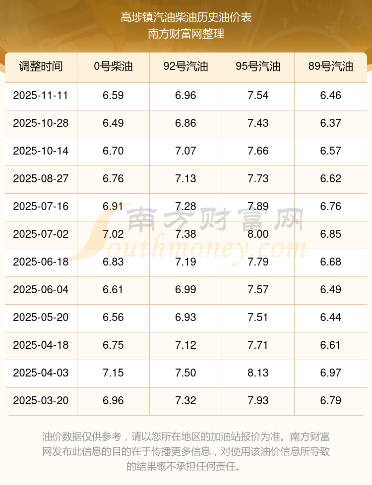 11月22日高埗镇汽油、柴油每升的价格是多少?详情如下:95号汽油为7.54元,涨了0.11元;92号汽油为6.96元,涨了0.1元;89号汽油为6.46元,涨了0.09元;0号柴油为6.59元,涨了0.1元,调整时间为11月11日。