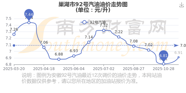 巢湖市92号汽油11月22日最新价格为6.91元每升,本轮油价调整时间为11月11日,相对上次调整时间10月28日的油价6.81元每升,共增了0.1元,增1.468%。