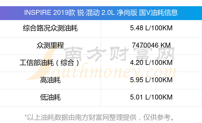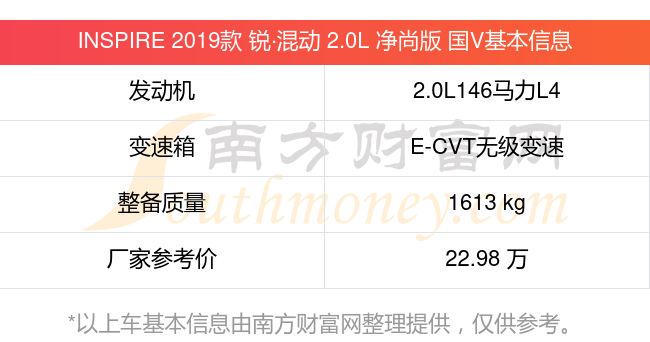 INSPIRE 2019款 锐·混动 2.0L 净尚版 国V动力上配备的是一台2.0L146马力L4自然吸气发动机,匹配的是E-CVT无级变速自动档变速箱,燃料形式为油电混合,常规整备质量1613kg,厂家参考价22.98万元。