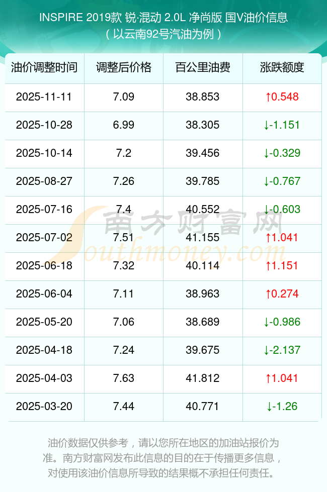 按照11月11日92号汽油最新调整价格7.09元/升来计算(以云南为例),该车型百公里平均油费为38.853元,按照上一轮10月28日调整价格6.99元/升来计算,百公里平均油费为38.305元,对比上一轮多花0.548元,下一轮油价调整时间为11月24日24时。