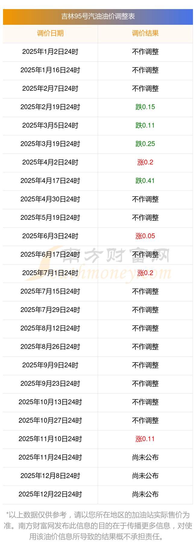 11月22日,吉林95号汽油的价格是7.45元每升,本次的调整时间为11月11日,对比上次的调整增了0.11元,增1.499%,11月24日24时为下一轮油价调整时间,还有2.32天。