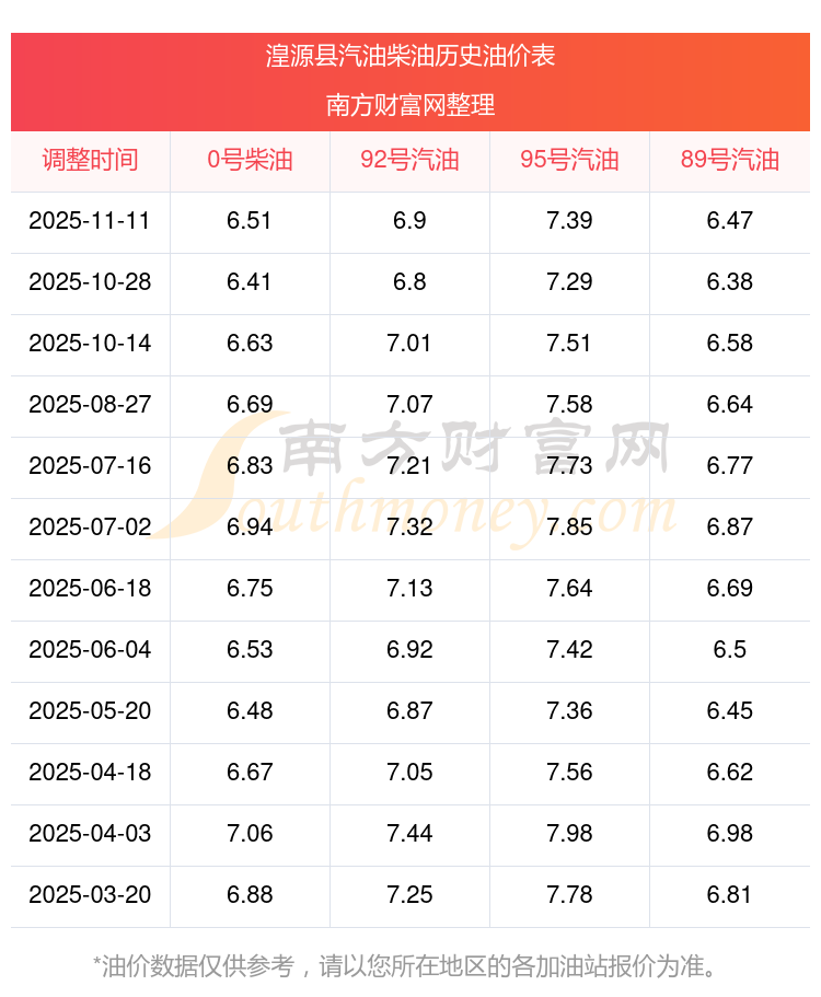 湟源县汽油柴油11月22日的价格每升多少钱?具体为:92号汽油为6.9元,上涨了0.1元;95号汽油为7.39元,上涨了0.1元;89号汽油为6.47元,上涨了0.09元;0号柴油为6.51元,上涨了0.1元,本轮油价的调整时间为11月11日。