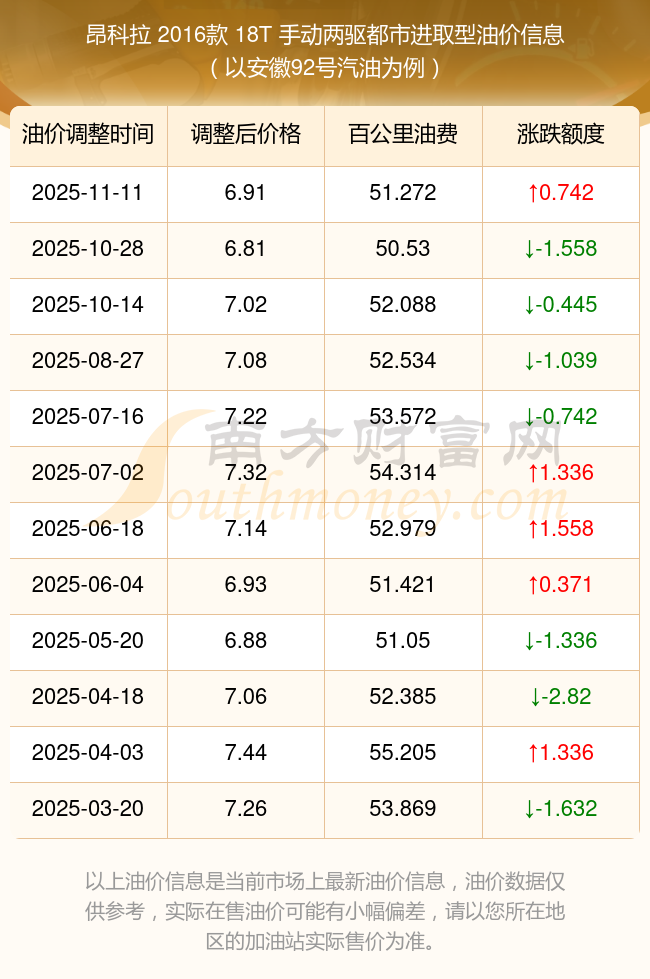 根据11月11日92号汽油最新调整价格6.91元/升来计算(以安徽为例),该车型每百公里的平均油费是51.272元,上一轮10月28日调整价格6.81元每升来计算,每百公里的平均油费是50.53元,对比上一轮多花0.742元,下一轮的油价调整时间是11月24日24时。