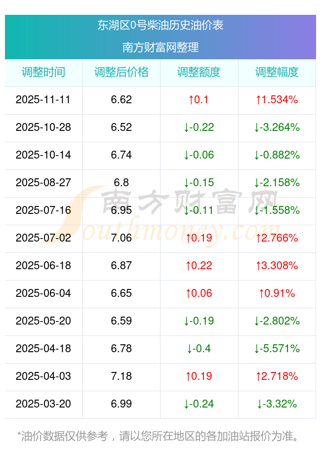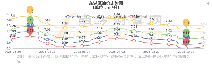 东湖区汽油、柴油11月22日每升的价格为(油价调整时间是11月11日):92号汽油6.91元;95号汽油7.41元;89号汽油6.42元;0号柴油6.62元。