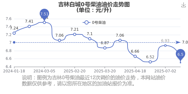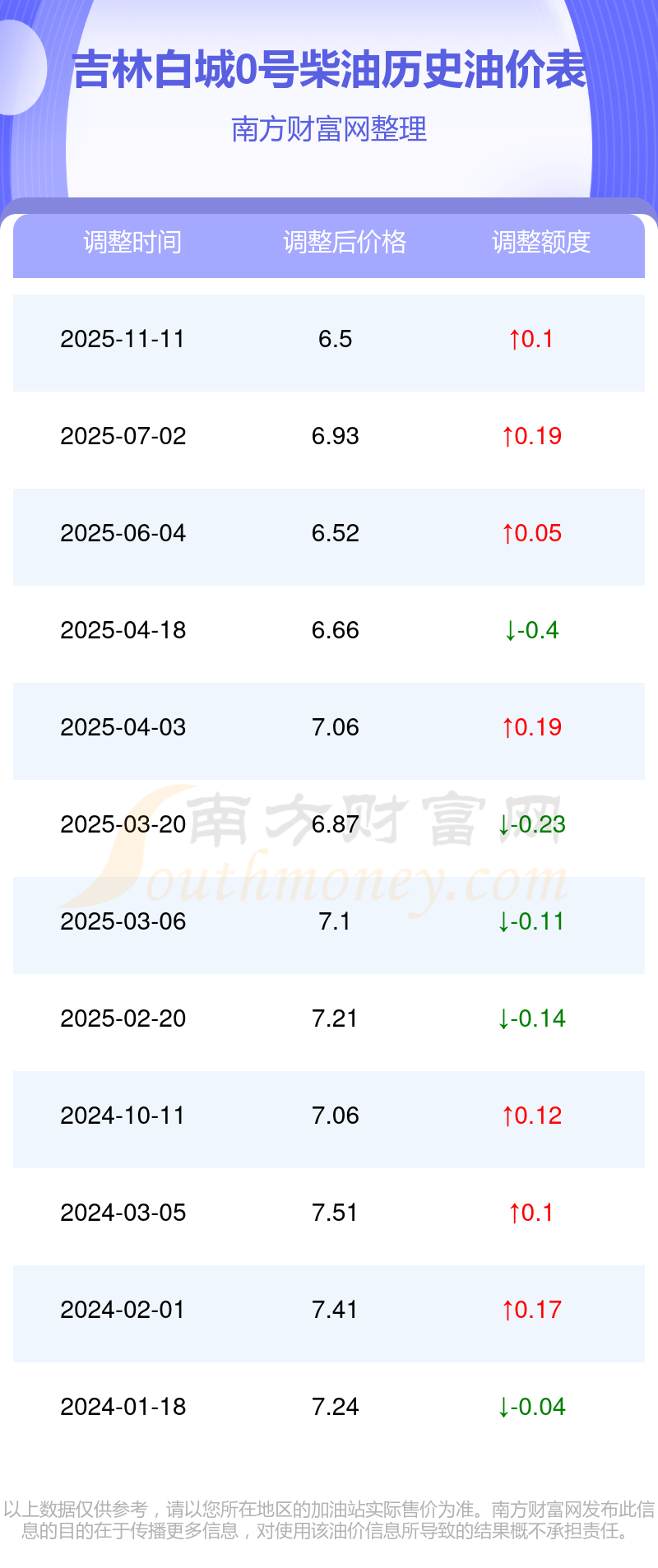 11月22日吉林白城0号柴油的价格为6.5元/升,这是11月11日调整后的价格,对比上轮调整上调了0.1元,上调1.563%。