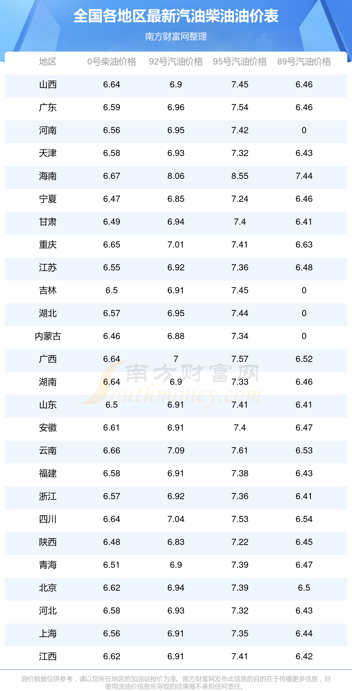 汽油价格调整最新消息:下一轮油价调整11月24日24时开启。本次油价的调整时间为11月11日,调整后全国油价详情为:92号汽油平均价格为7元每升,其中,最低的是陕西,6.83元每升,最高的是海南,8.06元每升。95号汽油平均价格为7元每升,其中,最低的是陕西,7.22元每升,最高的是海南,8.55元每升。0号柴油平均价格为:7元每升,其中,最低的是内蒙古,6.46元每升,最高的是海南,6.67元每升。89号汽油平均价格为7元每升,其中,最低的是浙江,6.41元每升,最高的是海南,7.44元每升。
