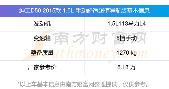 绅宝D50 2015款 1.5L 手动舒适超值导航版动力方面,搭载的是一台1.5L113马力L4自然吸气发动机,匹配5挡手动挡变速箱,燃料形式为汽油,常规整备质量1270kg,厂家参考价8.18万元。
