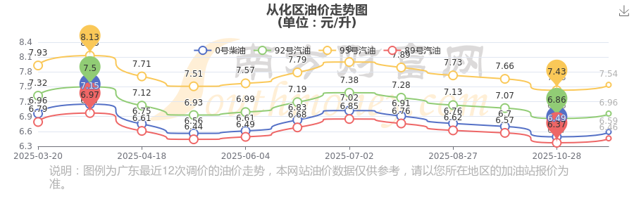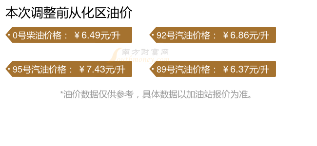 从化区汽油、柴油11月22日每升的价格具体是(11月11日调整后的价格):92号汽油6.96元;95号汽油7.54元;89号汽油6.46元;0号柴油6.59元。