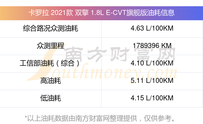 根据多位车主实测得出数据,该车型低油耗为4.15升/百公里,高油耗为5.11升/百公里,综合路况众测油耗为4.63升/百公里,工信部综合油耗为4.10升/百公里。